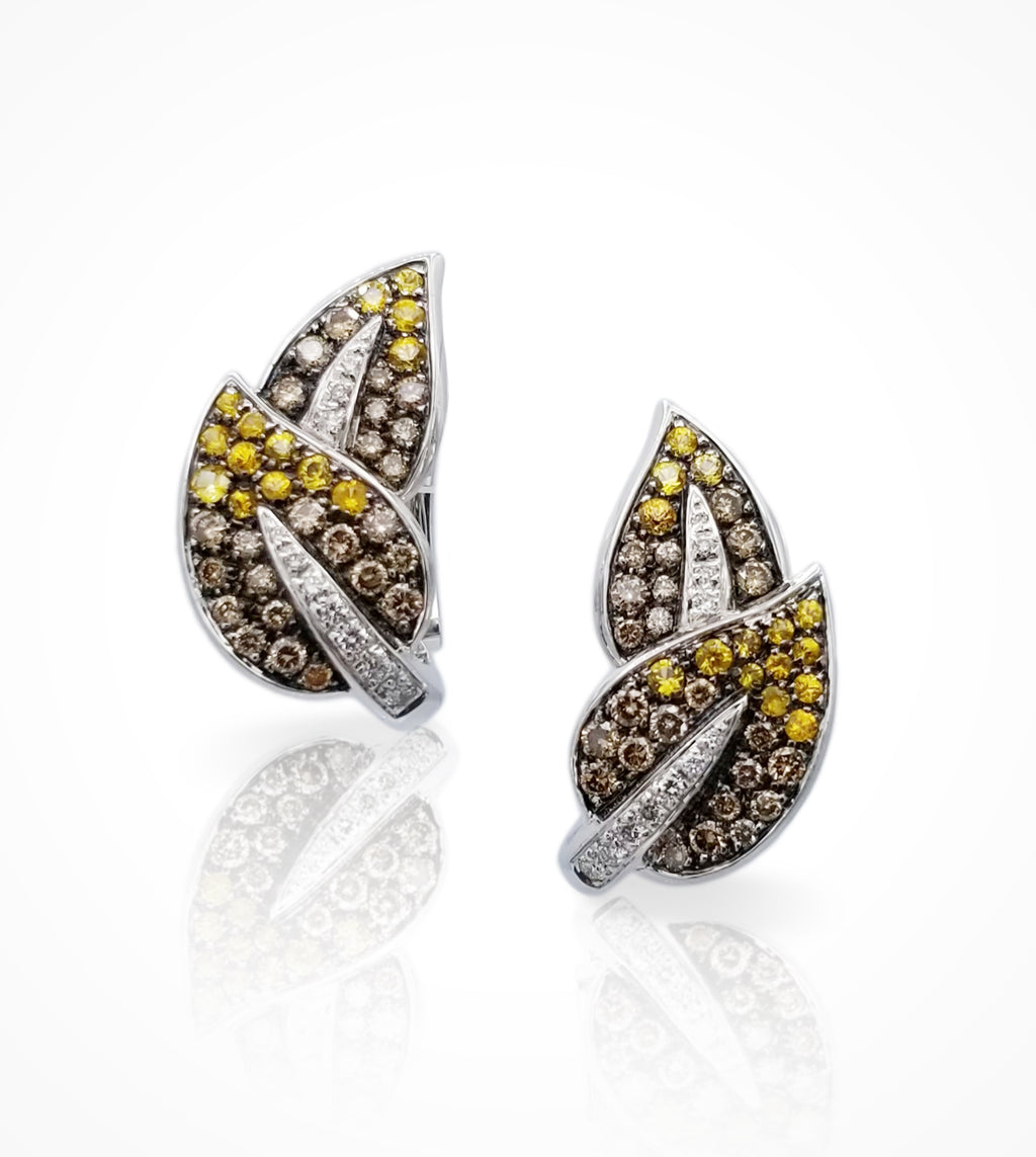EB-003907-18K white gold leaf motif pave earrings with white and brown diamonds=1.36cts, yellow sapphires=0.87cts