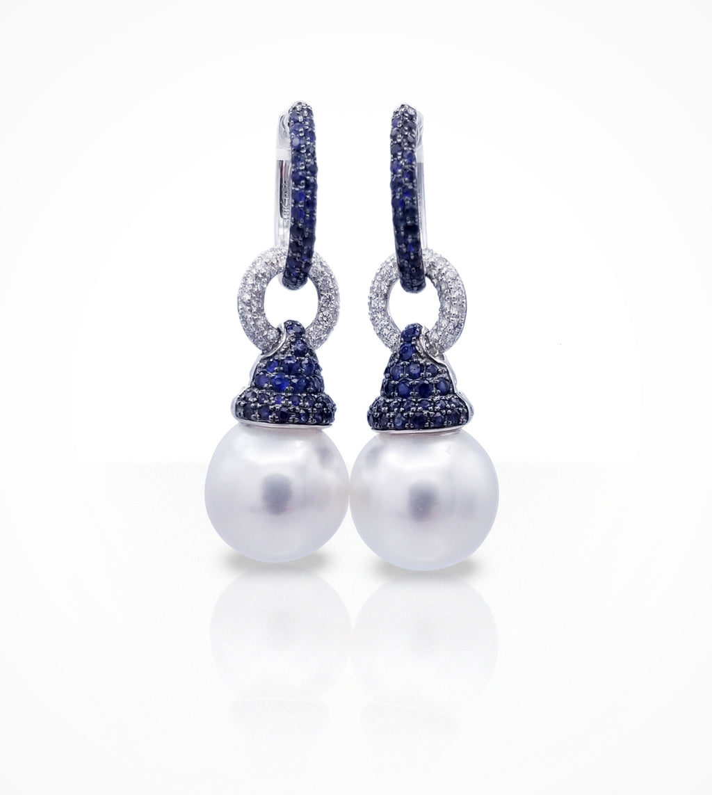 ER00470-18K white gold, White South Sea 12-13mm pearls, diamonds=0.52cts and sapphires=-1.05cts