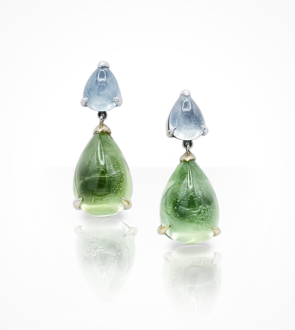 ER00530-18K white and yellow gold drop earrings, 2 peridot cabochons = 20.8cts, 2aquamarine cabochons = 3.39cts SOLD
